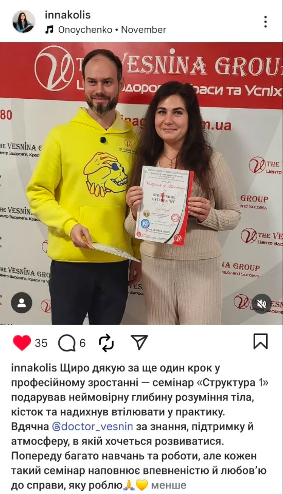 Веснін Володимир Вікторович – Лікар ортопед-травматолог, лікар фізичної та реабілітаційної медицини, кандидат медичних наук, доцент кафедри екстреної та невідкладної медичної допомоги, ортопедії, травматології та протезування ХНМУ; Остеопат, краніосакральний терапевт, фахівець з тілесно-емоційного звільнення; Психосоматичний терапевт, психолог; Спеціаліст по кінезіотейпуванню; Кваліфікований масажист; Косметолог-естетист; Директор з організації та управління Центру Здоров’я, Краси та Успіху «The Vesnina Group»; Засновник Міжнародної Академії Практичної Остеопатії (МАПО).