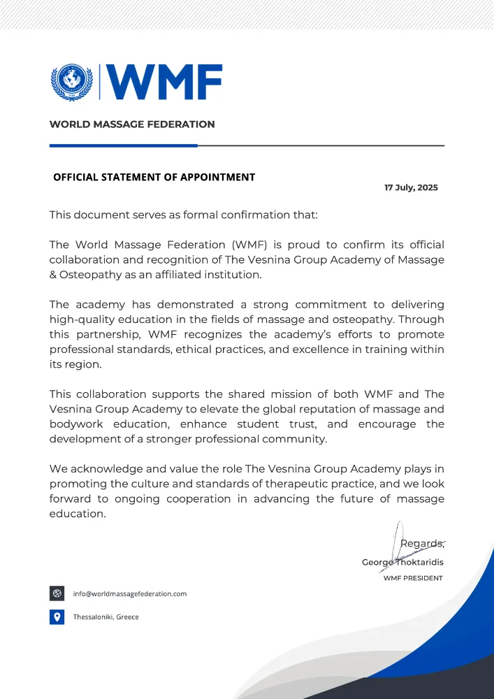 Мы рады сообщить нашим студентам, клиентам и партнерам, что Центр здоровья, красоты и успеха получил официальное подтверждение статуса аффилированного учреждения World Massage Federation (WMF).