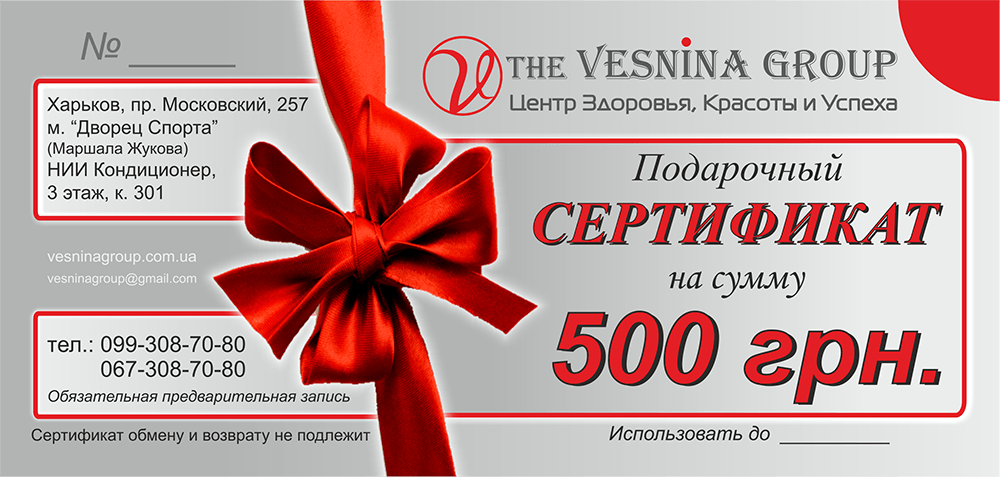 Кто сказал, что купить и подарить здоровье нельзя? Центр Vesnina Group предлагает купить подарочный сертификат для женщин (мамы), мужчин (папы), друзьям и близким в подарок на день рождение или другой праздник на любую услугу нашей сети.