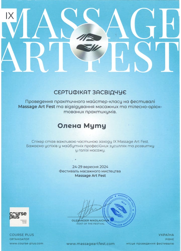 - Победитель чемпионата по массажу лица в Ровно 2024 г.