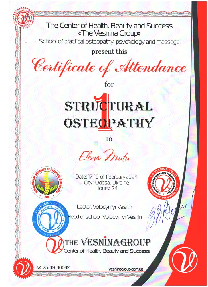 Остеопат, краниосакральный терапевт, специалист по висцеральной и структуральной остеопатии, мастер миолифтингового массажа, косметолог — эстетист.