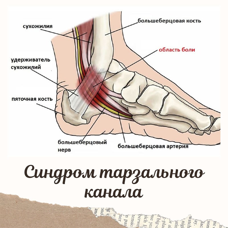 Великогомілковий нерв проходить позаду внутрішньої кісточки. Далі нерв проходить під смугою волокнистої сполучної тканини, яка називається утримувач згиначів. Утримувач згиначів формує свого роду тунель для сухожиль, судин та нервів, що виходять на підошовну поверхню стопи. Тунель утворений кістковою поверхнею внутрішньої кісточки з одного боку і смужкою волокнистої сполучної тканини, утримувачем згиначів, – з іншого.