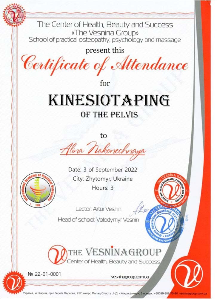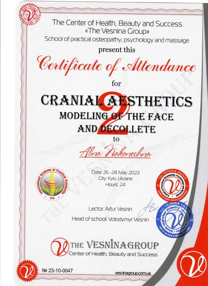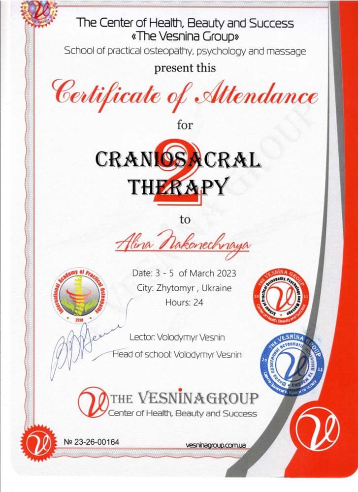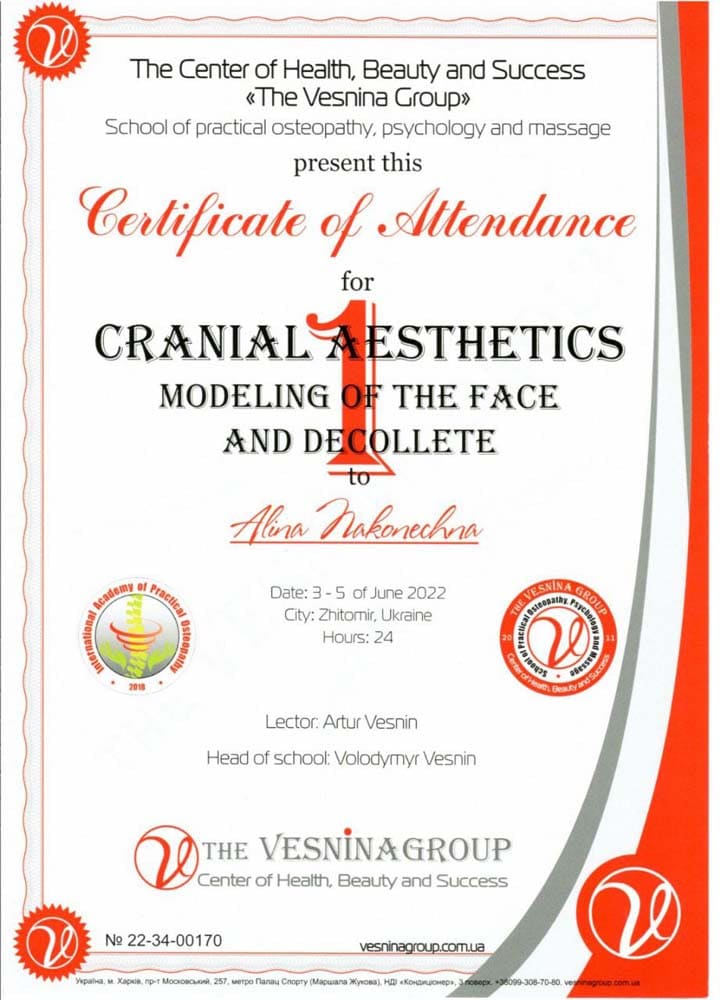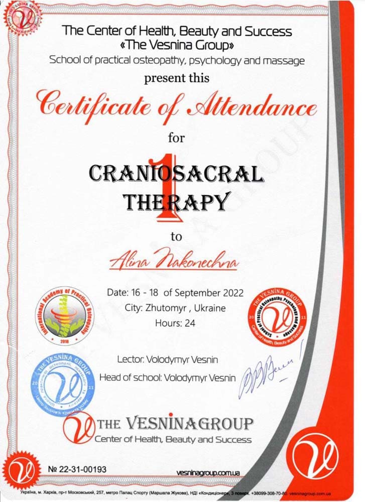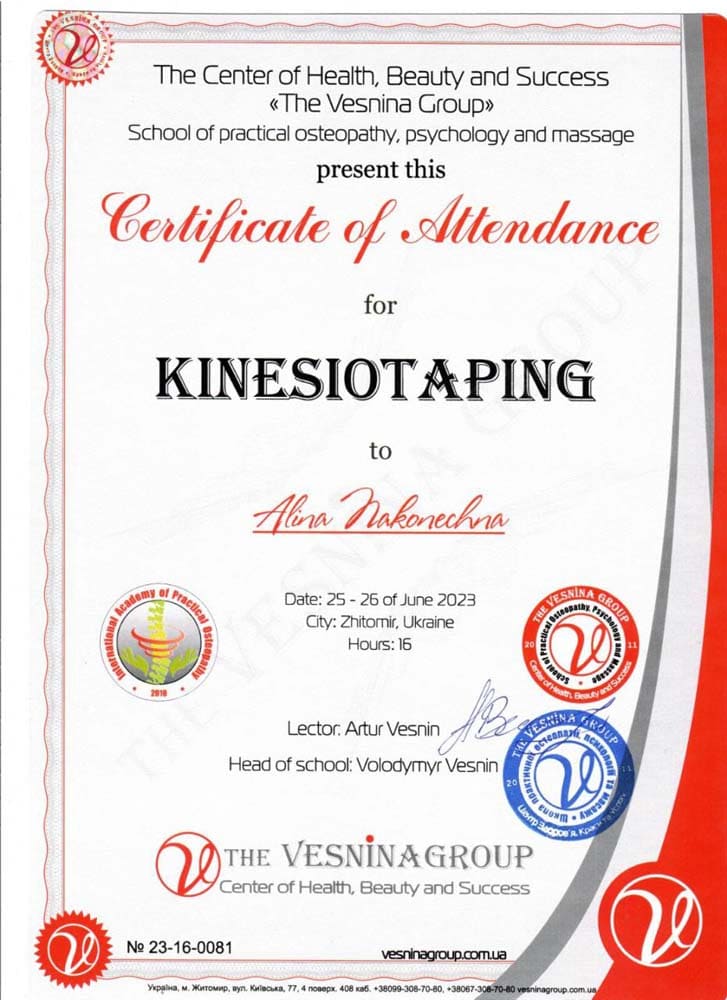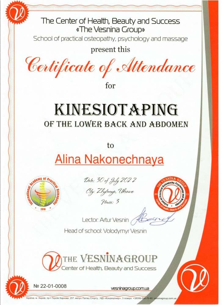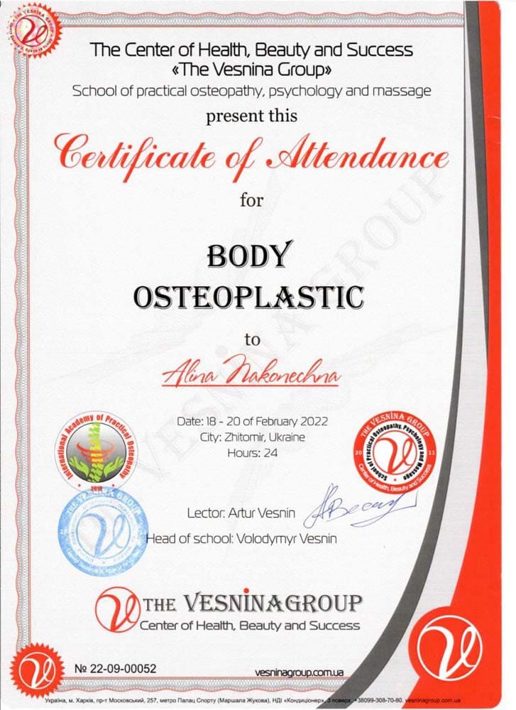 Аліна Наконечна – спеціаліст з остеопатії, остеопластики, краніальної естетики та краніосакральної терапії, кінезіотейпування.