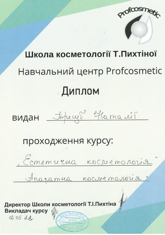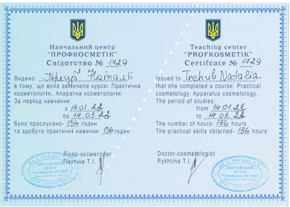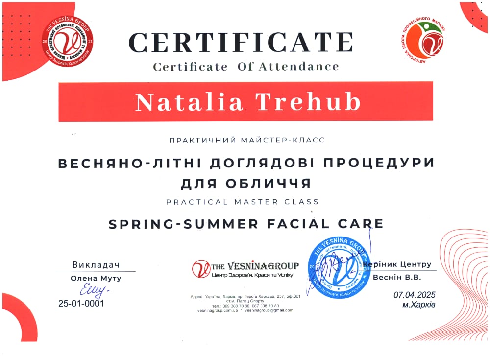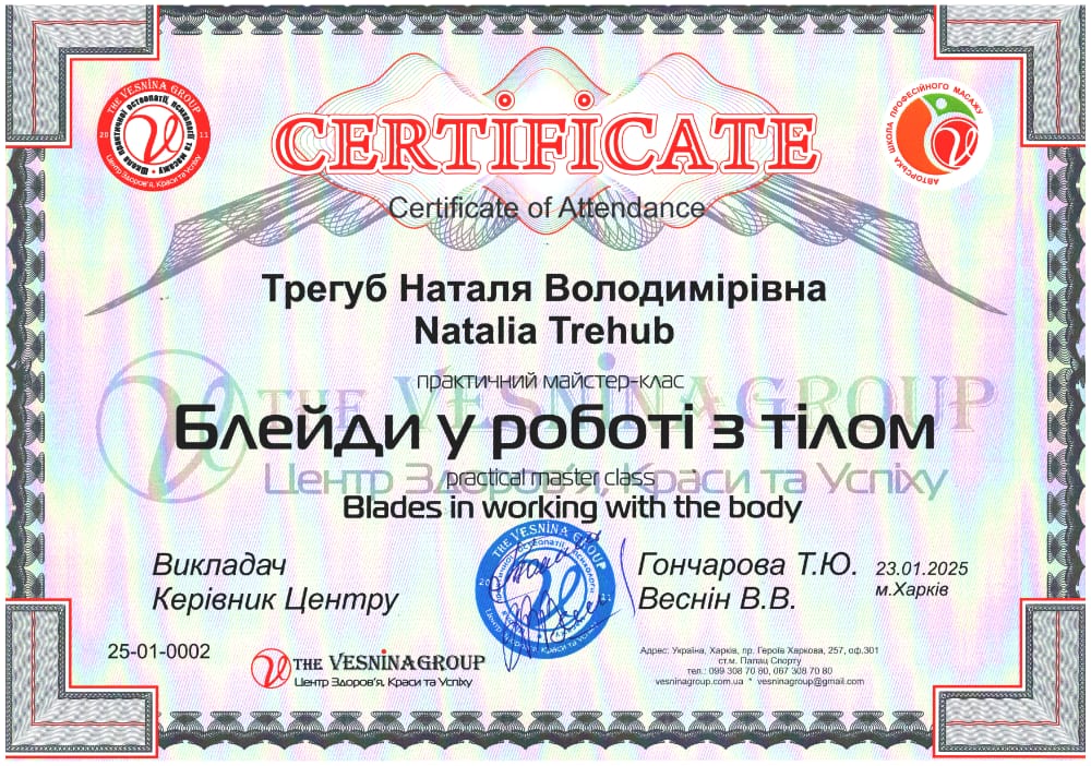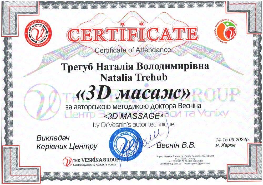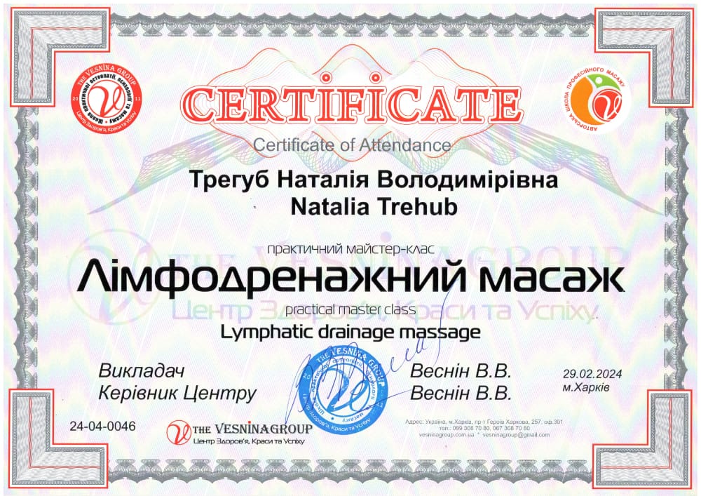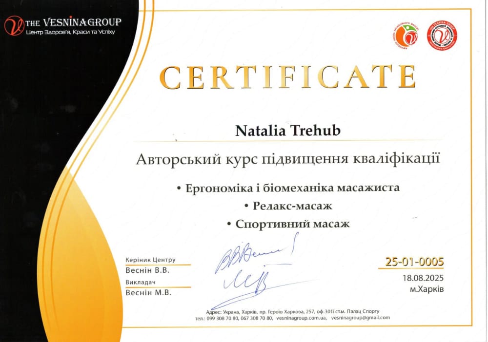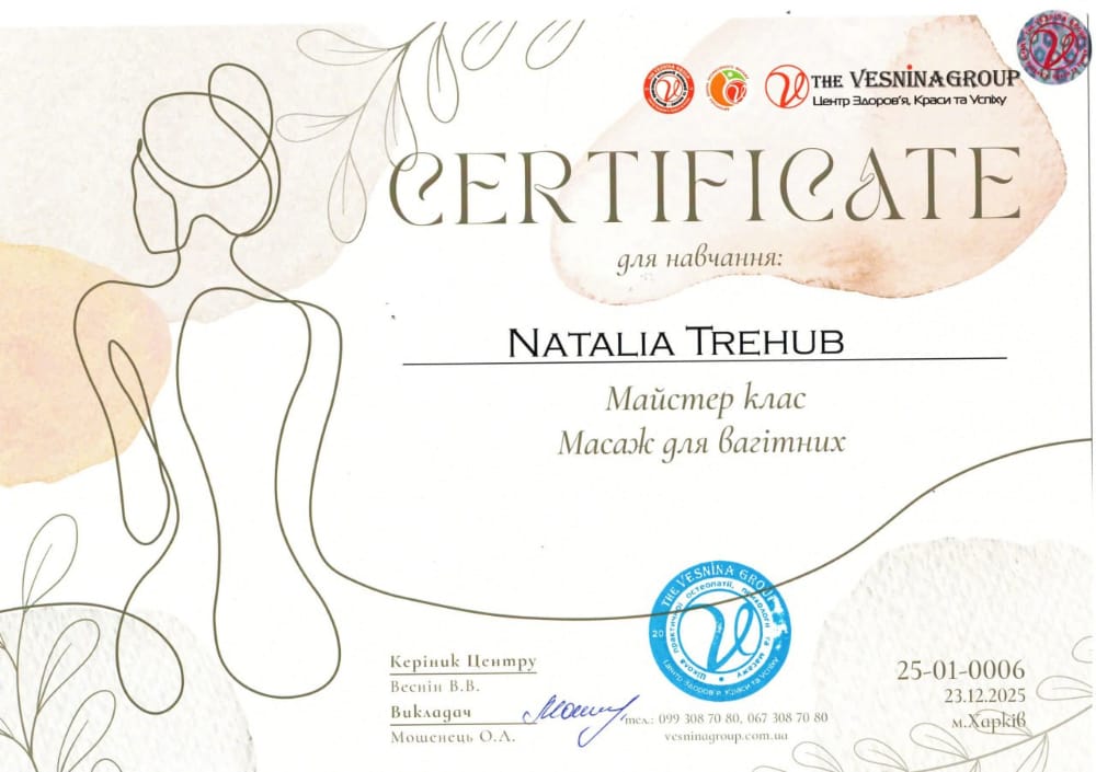Трегуб Наталія – майстер з масажу, дипломований спеціаліст.